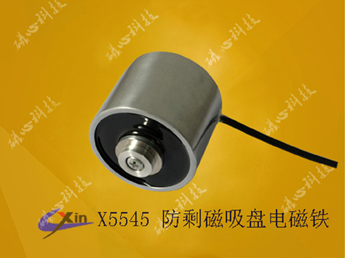 X5545防剩磁吸盤電磁鐵屬于微型直流吸盤式電磁鐵電磁鐵廠家研發、生產的防剩磁吸盤電磁鐵X5545具有大吸力的同時可以有效的把剩磁降低至5克之內,產品的直徑為55mm,高