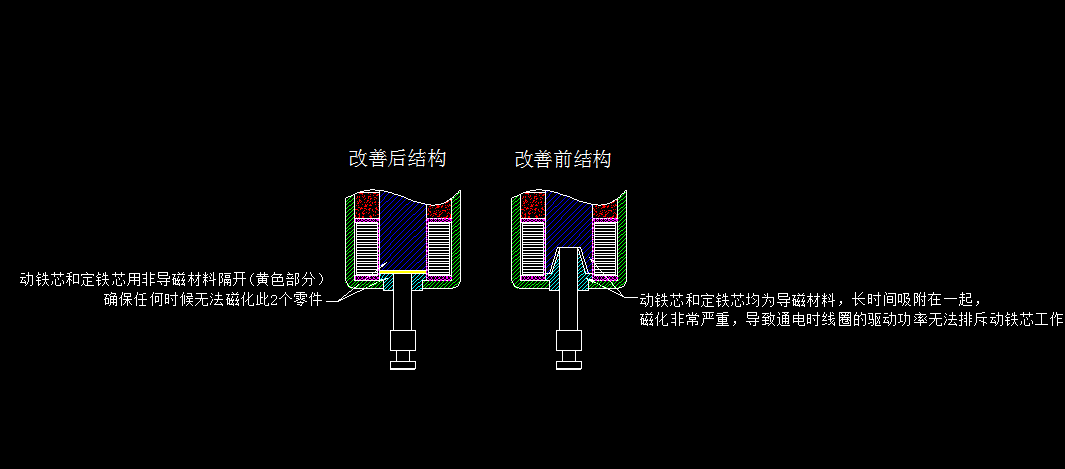 上面是保持式電磁鐵的基本原理,其中動鐵芯需要和鐵芯以及蓋板長時間的接觸(保持時候),動鐵芯和鐵芯都是導(dǎo)磁材料,在通電情況下或者不通電情況下都會被磁化,要讓動鐵芯順暢工作,產(chǎn)生的作用力一定要大于磁化和磁鐵的磁力