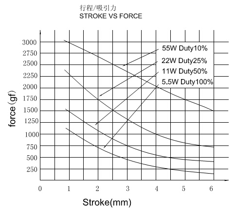 圖解:1,上圖描述的是推拉式電磁鐵的行程和力量曲線圖